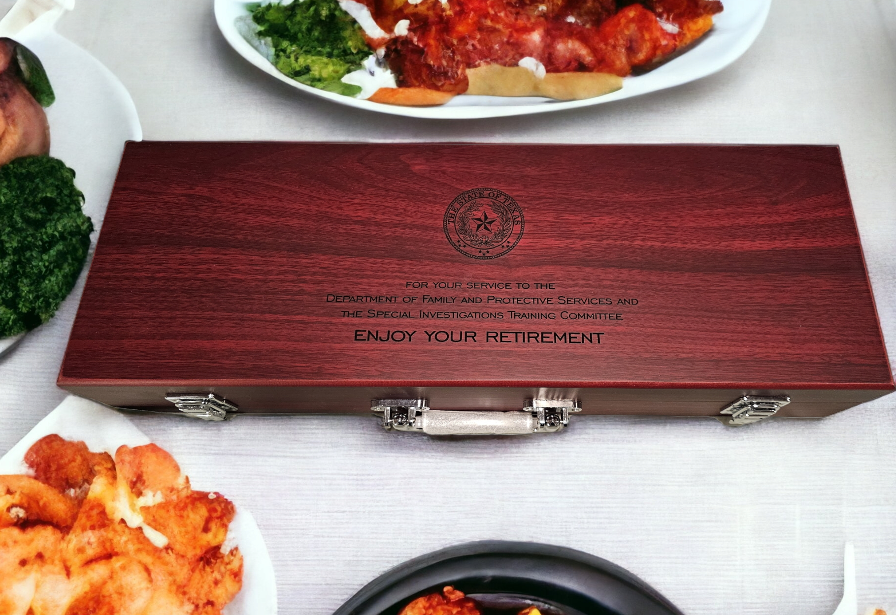 BBQ Sets are a great gift for the grill guru in your life! They come with tools in a beautiful rosewood box with your custom laser engraving.